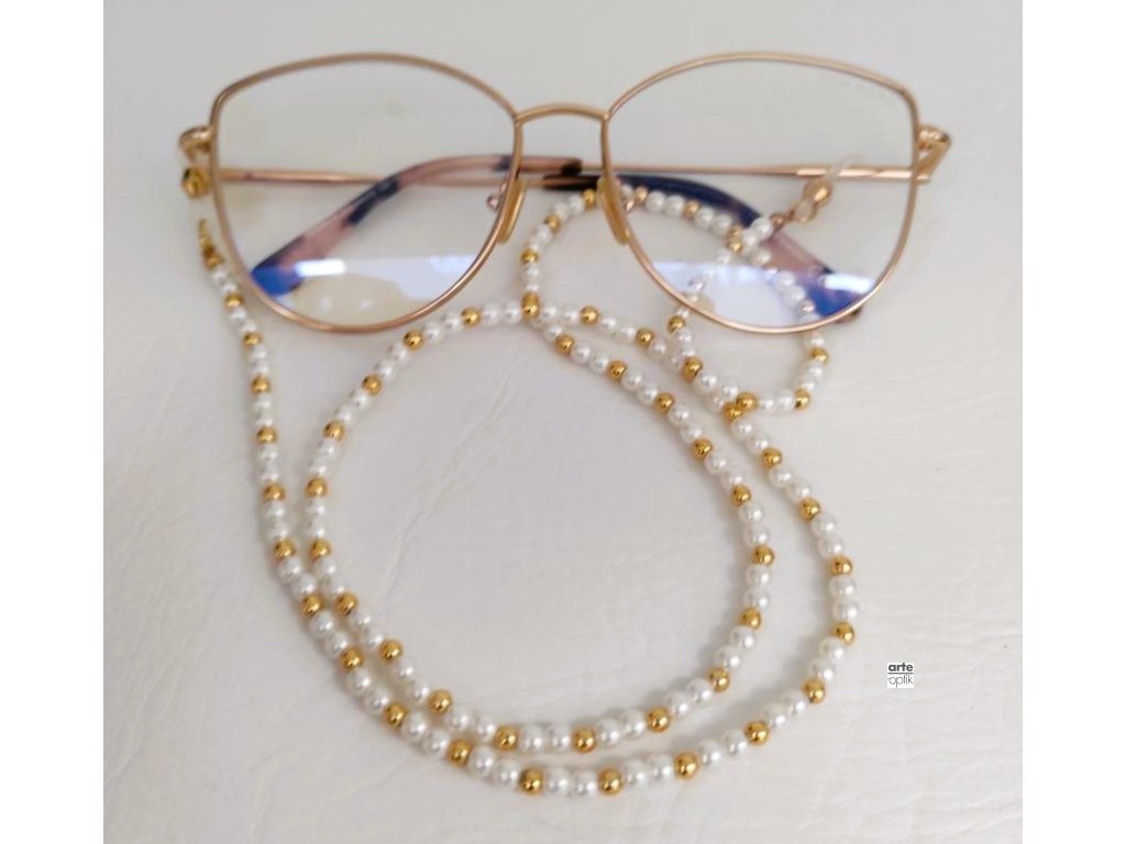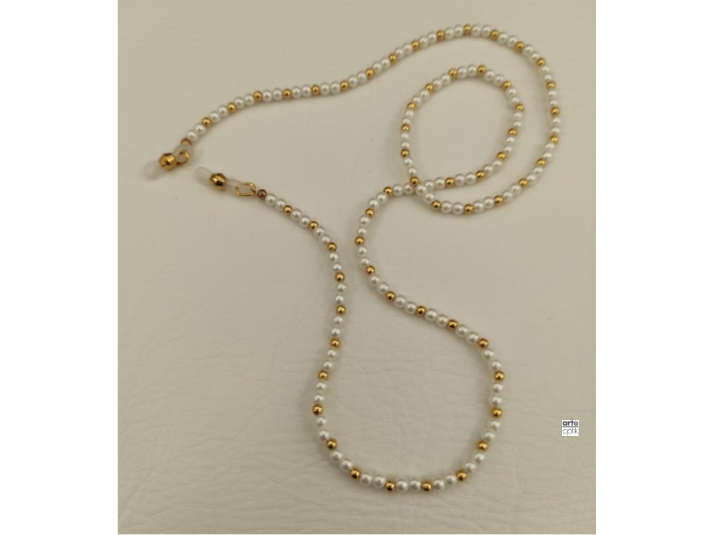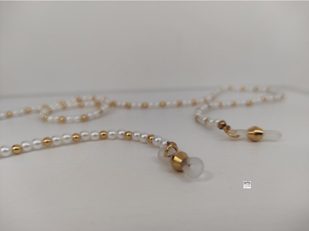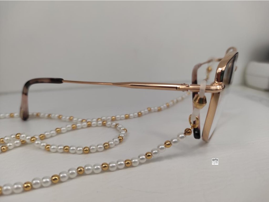 Decentní řetízek na brýle v klasickém stylu s bílými ozdobnými perličkami. Řetízek neobsahuje nikl.